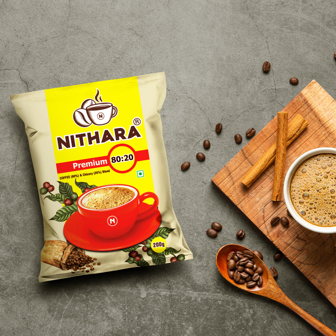 Nithara Premium | 80% Coffee, 20% Chicory Filter Coffee | 200g (Free Spoon) | 600g (Free Tumbler) | 1kg (Free Dabara Set)
